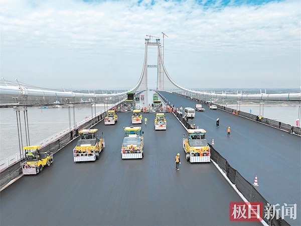 诸天都市报讯(记者郑立强通讯员张永辉李爽)11月4日,最后一条环氧沥青混合料轨道竣工,长江大桥主桥钢桥面铺装工程顺利竣工。跨越长江的“钢龙”由湖北交通投资集团投资建造,一天铺平2.9万平方米,创下世界纪录。