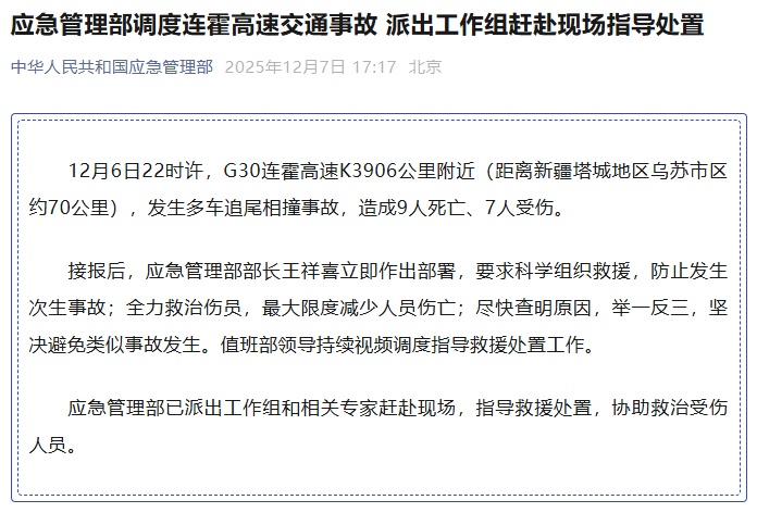 12月6日22时00分左右,G30连霍公路K3906附近(距新疆维吾尔自治区塔城县乌苏市约70公里)发生多车相撞事故,造成9人死亡、7人受伤。接到报告后,应急管理部部长王祥熙立即作出部署,要求科学救援,避免发生二次事故。千方百计救治伤者,尽量减少人员伤亡。尽快查明原因,举一反三,坚决避免类似事故发生。服务队长持续发送视频,指导救援处置工作。应急管理机构已派出工作组和相关专家赶赴现场指导救援并协助救治伤者。截取微信公众号屏幕